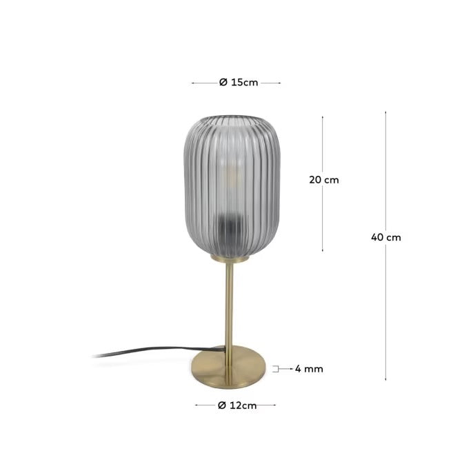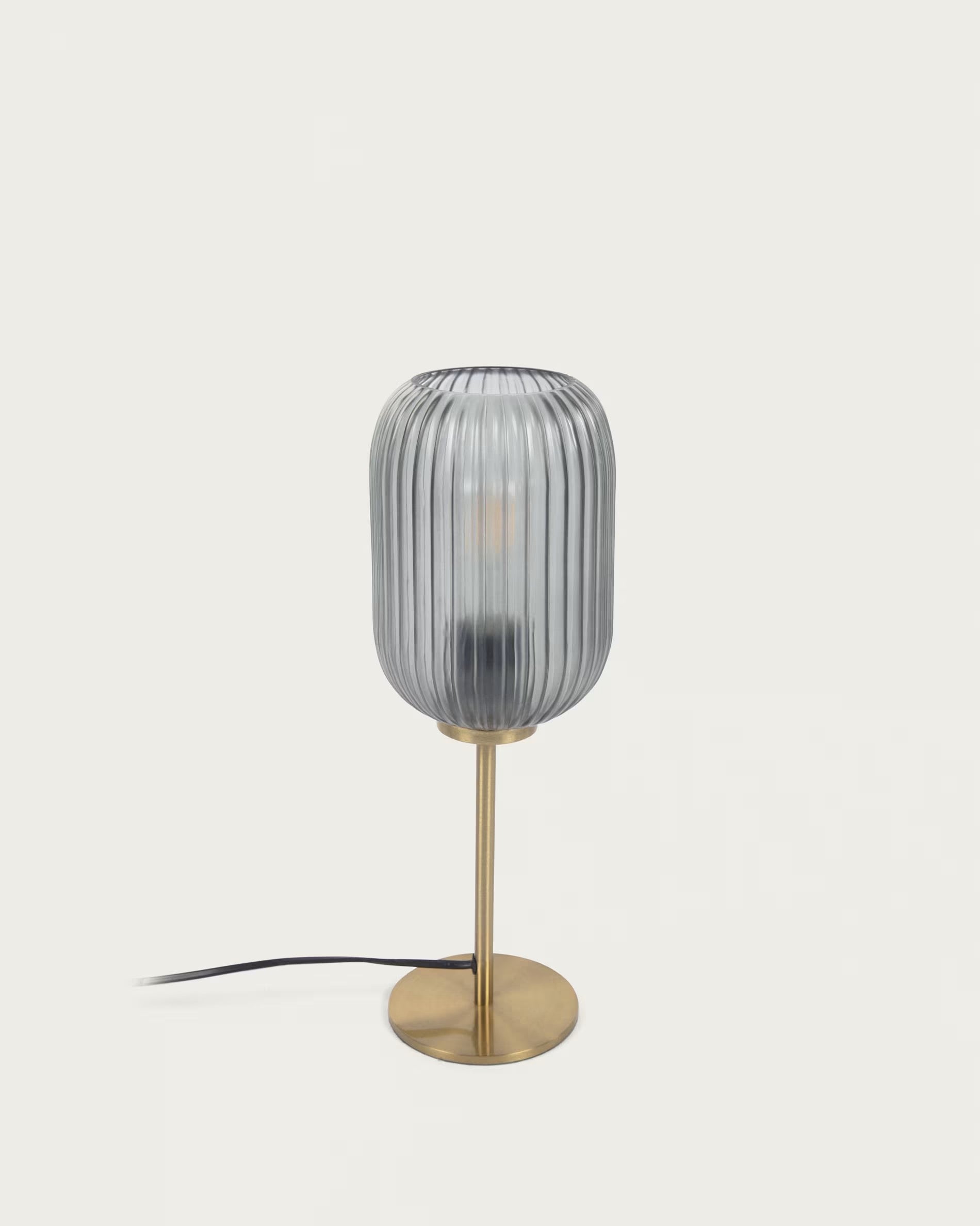 Lampada da tavolo Hestia in metallo con finitura in ottone e cristallo grigio