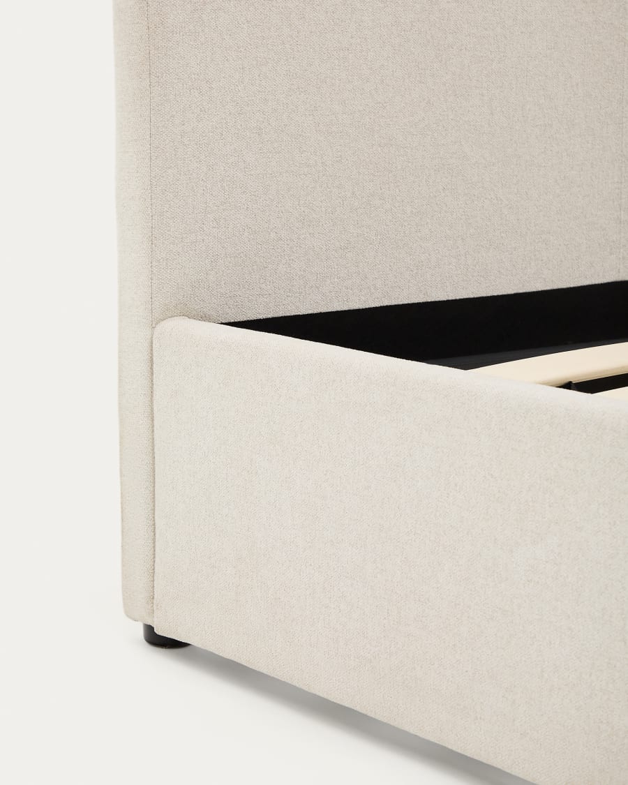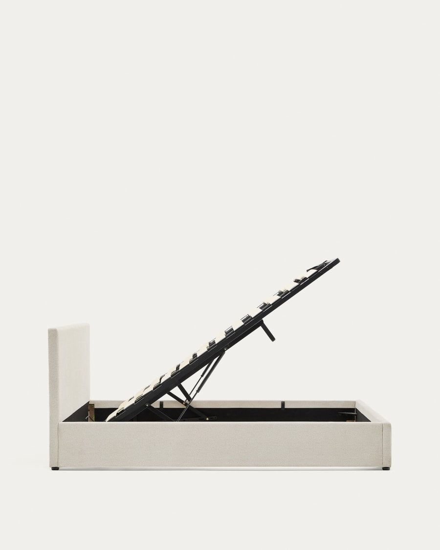Questo letto rivestito combina design e funzionalità per offrire un riposo confortevole e uno spazio di stoccaggio extra senza compromettere lo stile. La sua struttura è rivestita in tessuto di ciniglia con trattamento antimacchia, per una finitura morbida e resistente. Fornitore del tessuto certificato OEKO-TEX® STANDARD 100 per una produzione ecologicamente sicura e responsabile dal punto di vista ambientale. La base del letto è sollevabile e, grazie al suo meccanismo a pistoni a gas, consente di accedere facilmente e senza sforzo allo spazio di stoccaggio. Progettato per adattarsi a qualsiasi camera da letto, incorpora protezioni in plastica sulle gambe per evitare danni al pavimento e garantire una maggiore stabilità . Una soluzione pratica ed elegante che ottimizza lo spazio senza compromettere il design.