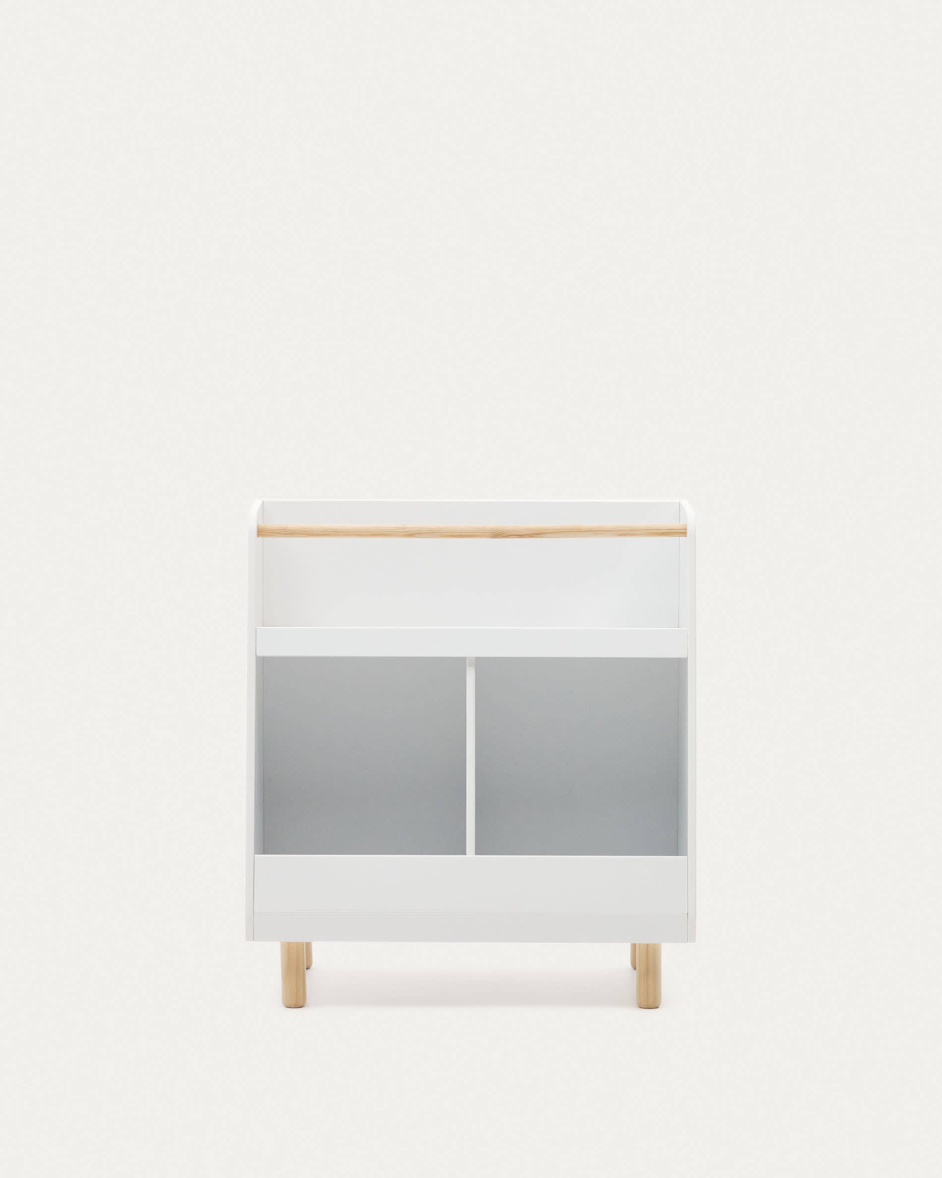 Libreria Serwa in MDF bianco con gambe e tavoletta in legno massiccio di pino