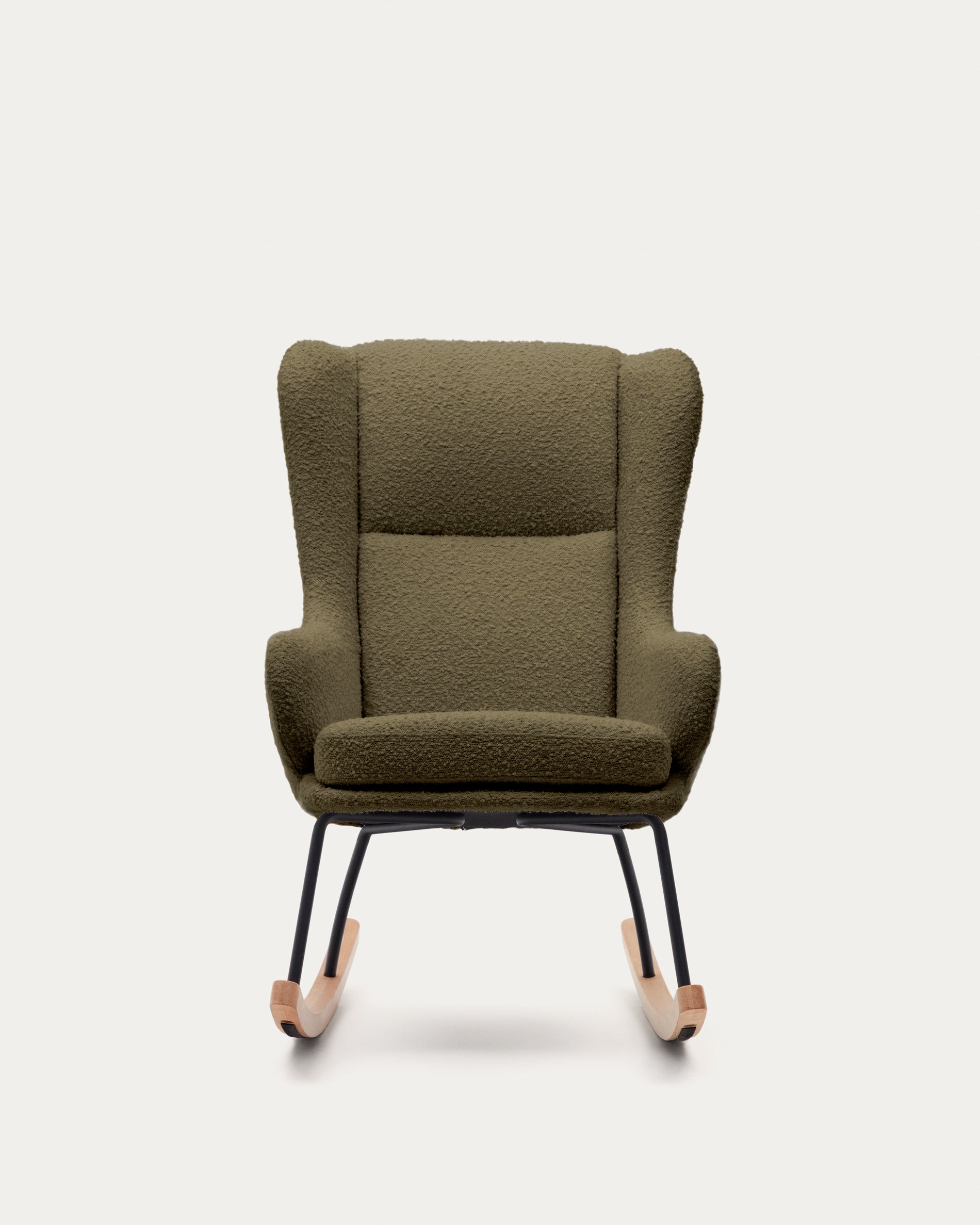Poltrona a Dondolo Maustin con tessuto effetto shearling verde scuro, telaio in acciao nero e legno di faggio.