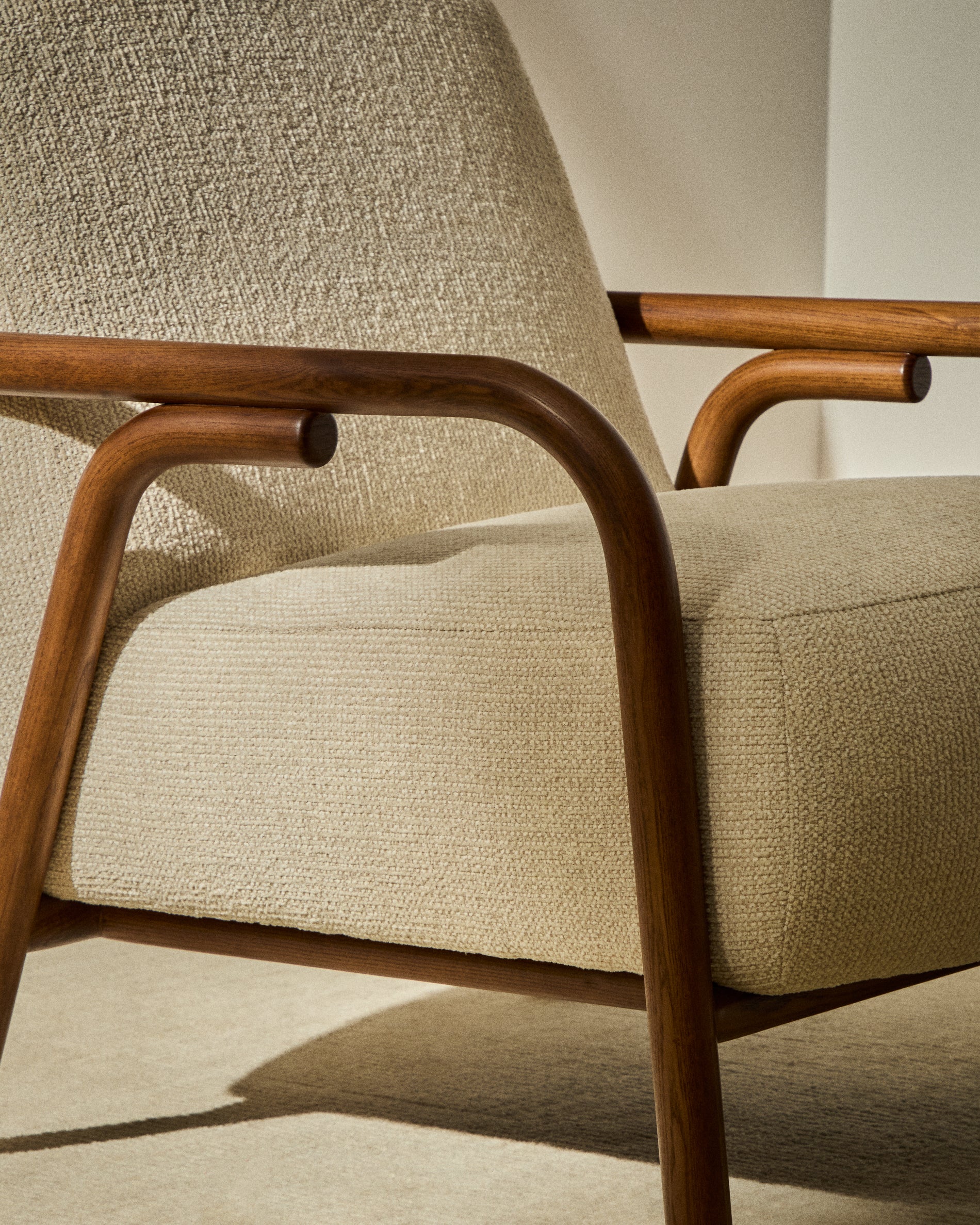 Poltrona Sylo in ciniglia beige e legno massiccio di frassino con finitura color noce