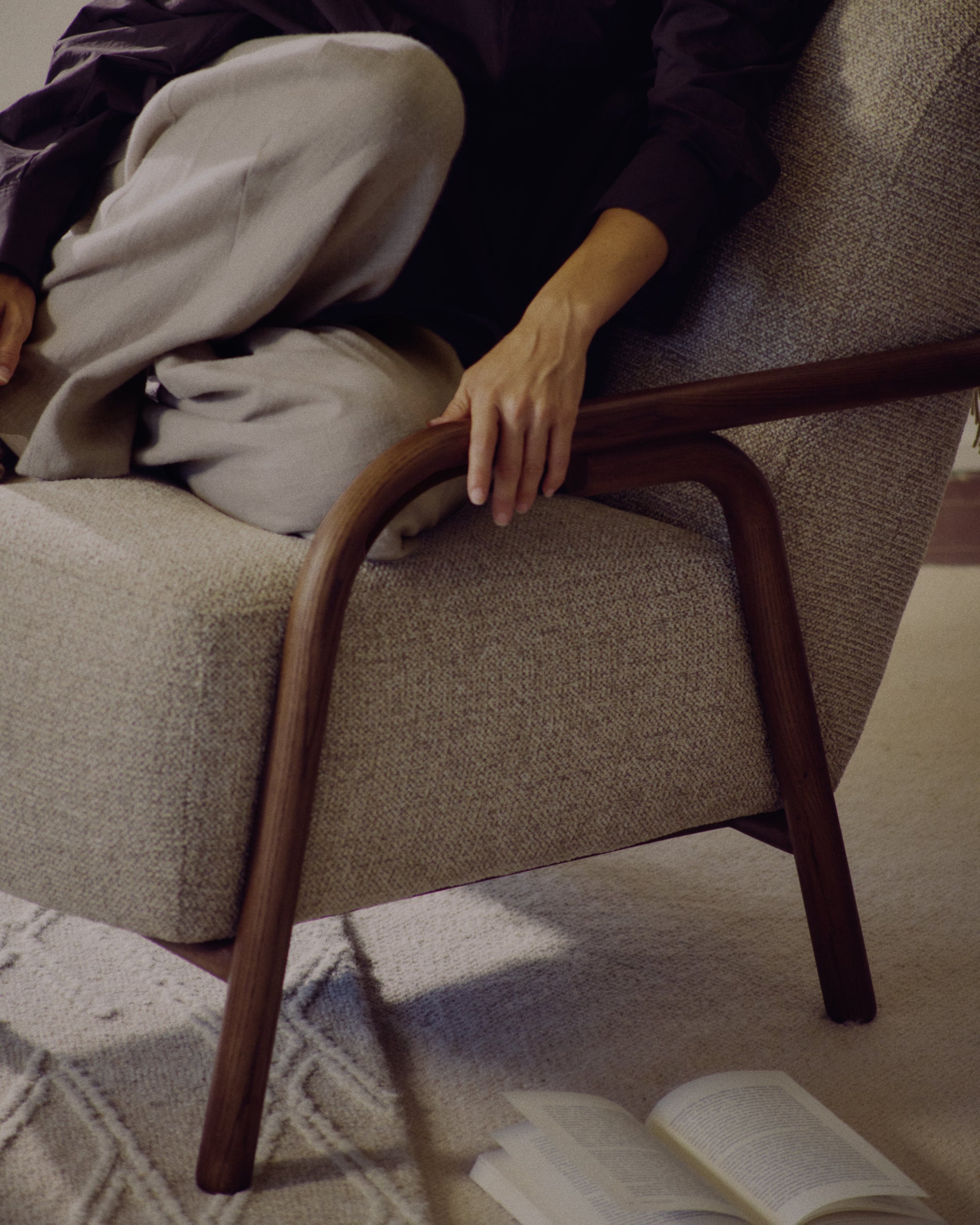 Poltrona Sylo in ciniglia beige e legno massiccio di frassino con finitura color noce FSC 100%